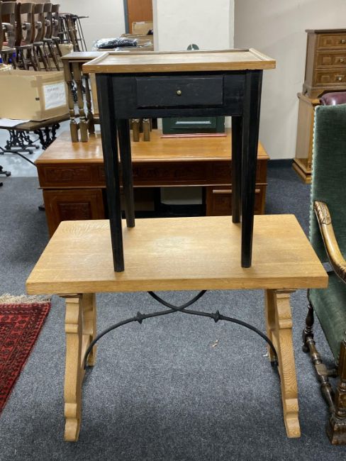 A blond oak refectory coffee table together with a pine painted side table fitted with a drawer