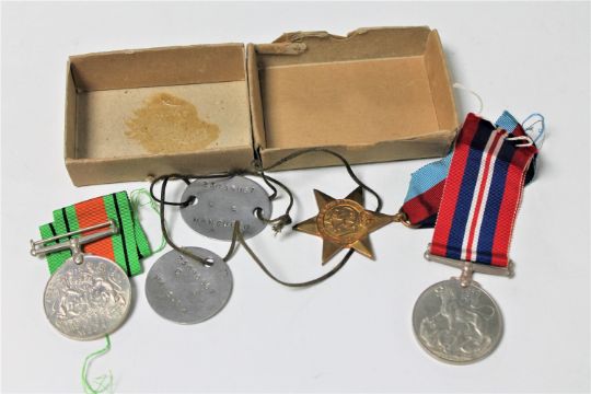 A WWII medal trio comprising War Medal, Victory Medal and 1939-45 Star, together with a pair of metal dog tags named to A. Mansueto