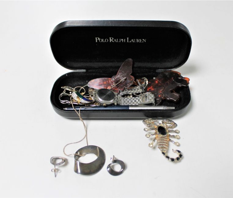 A glasses case containing a small quantity of costume jewellery, silver necklace and matching earrings, lady's wristwatch, Parker pen