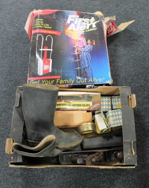 A First Alert fire escape ladder and a box of Stanley woodworking plane, inspection lamp, screws etc