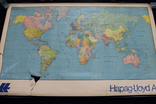 A mid 20th century pull down school map of the world by Hapag-Lloyd AG