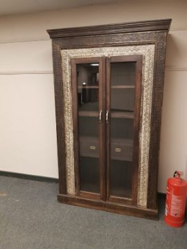 An Eastern carved hardwood glazed double door cabinet fitted with two drawers , width 121 cm