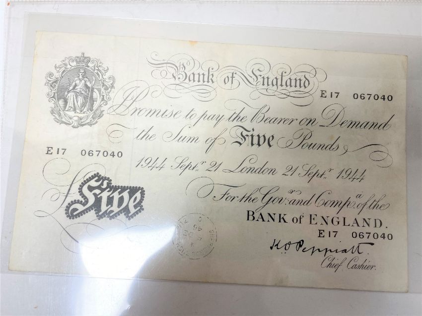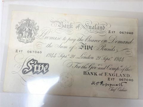 A five pound Bank of England Note no. E17 067040.