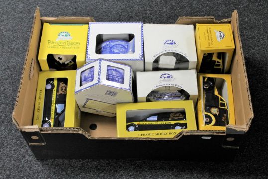 A box of five boxed Ringtons money boxes, Ringtons miniature jug, Ringtons teapot, bridges bowl and bridges teapot