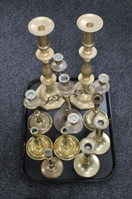 A tray of brass candlesticks and other brass ware