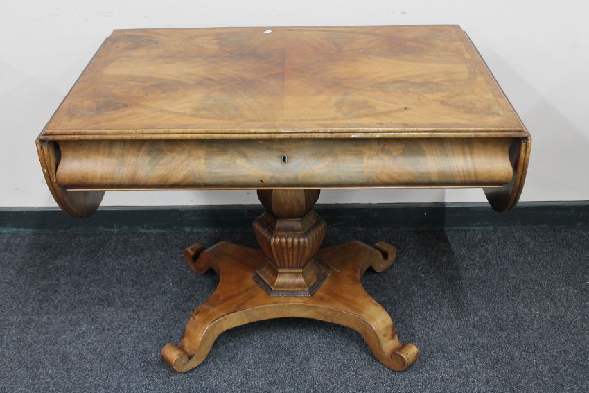 A continental mahogany library table fitted with a drawer on four-way pedestal