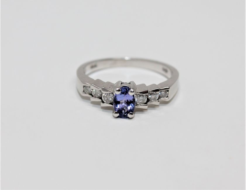 A 14ct white gold tanzanite and diamond ring, size N.