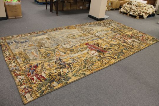 A very large tapestry wall hanging, 467 cm x 237 cm, depicting traditional figures in front of a castle