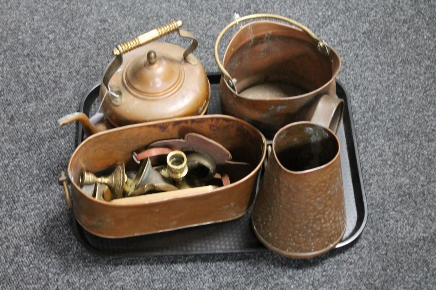 A tray of copper kettle, planter, brass candlesticks etc