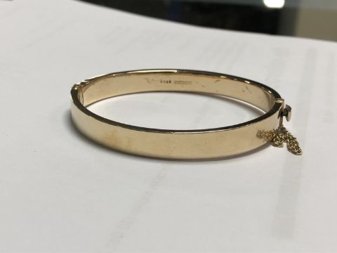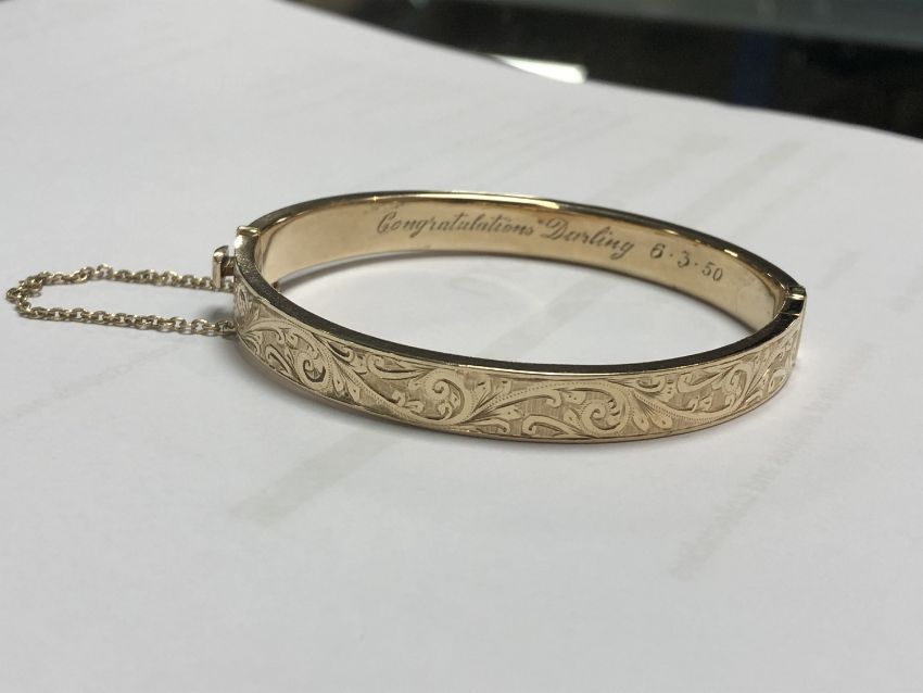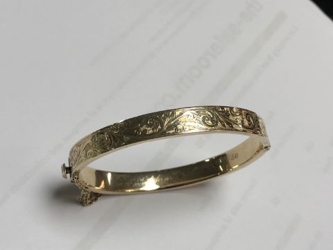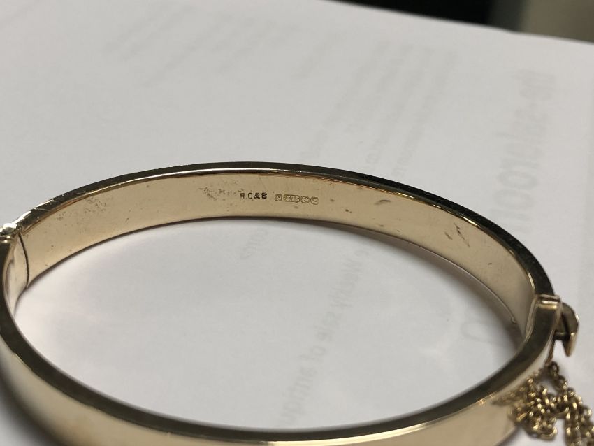 12.3g. Internal measurements 6cm by 5cm. The bangle appears to be in good condition. Inscription dated 1950. Hallmarked 9ct gold.