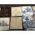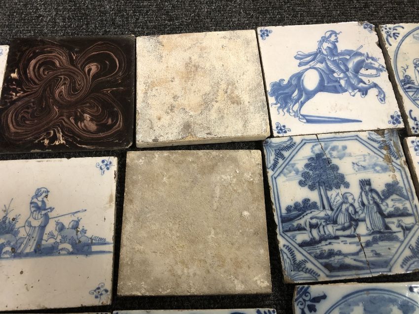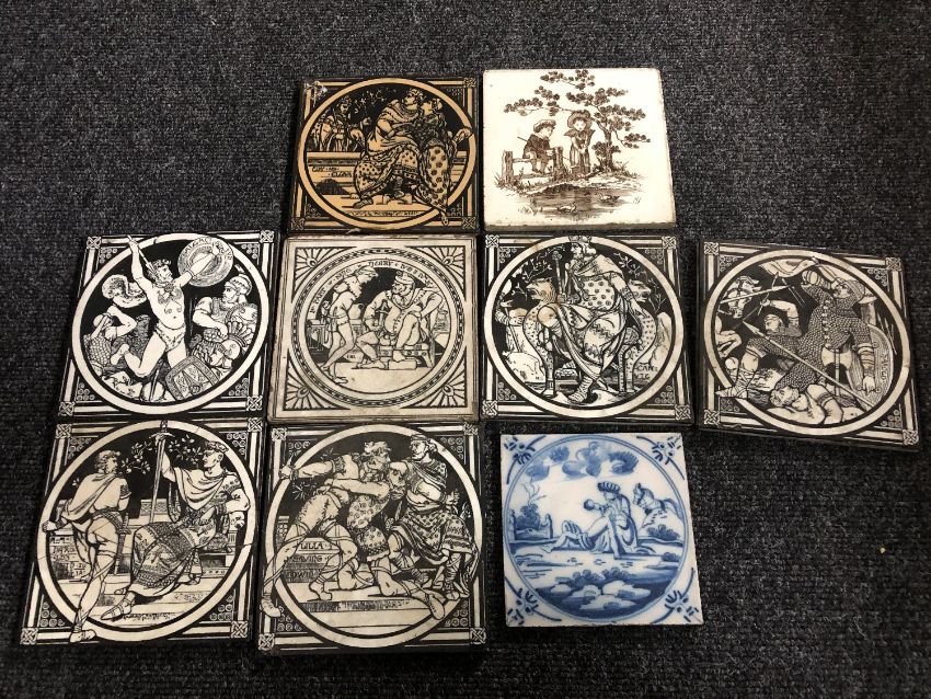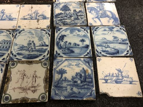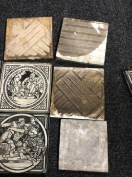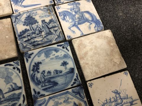 A quantity of blue and white antique tiles and a wooden crate of several Minton china tiles