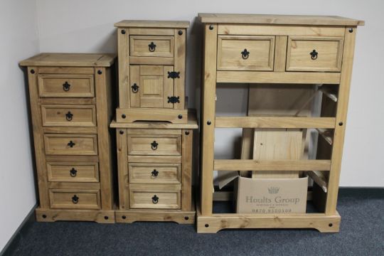 A pine five drawer narrow chest, two bedside cabinets and a part-built chest of drawers