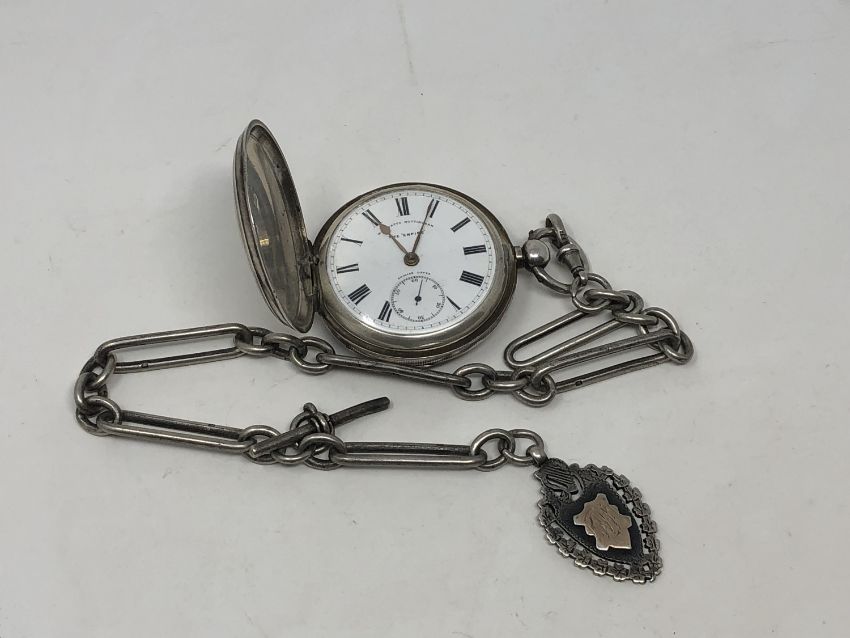 A large heavy antique silver Hunter pocket watch on heavy antique Albert chain