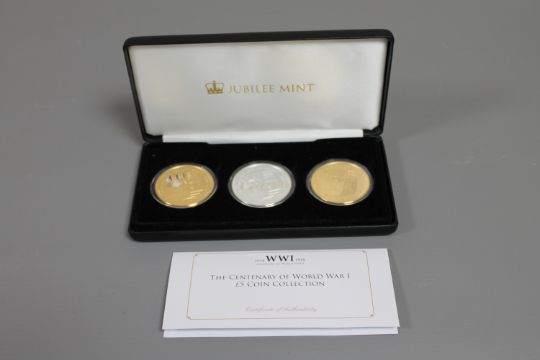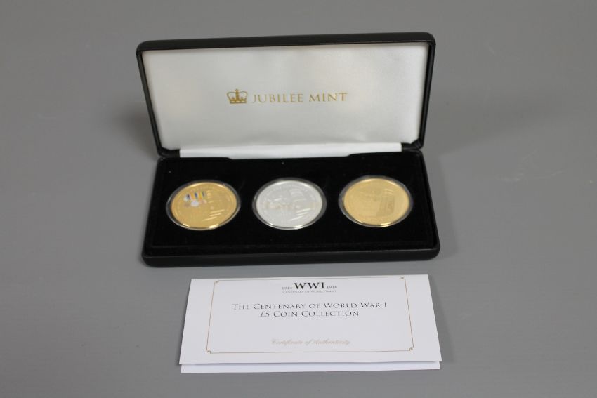 A Jubilee Mint three coin set, 'The Centenary of World War I £5 Coin Collection', three 24ct gold or pure-silver plated coins, a limited edition of 2018, boxed with certificate of authenticity.