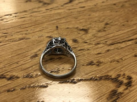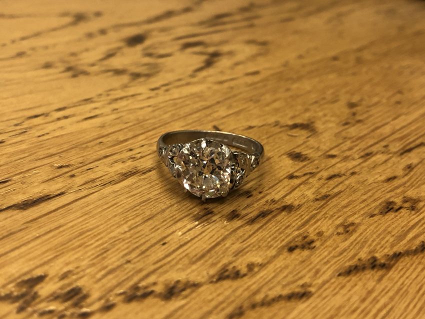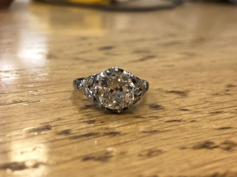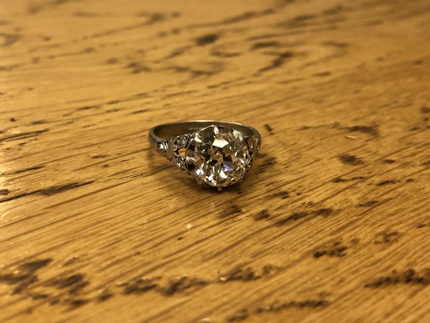 The ring is in good condition. The diamond measures approximately 8.45mm by 8.19mm by 4.79mm = 2.12 carats. There are several very small chips to the girdle of the diamond, some of which are visible to the naked eye upon close inspection. I cannot see any internal cracks. There are several internal black inclusions, one of which is located in the centre of the diamond and is easily visible to the naked eye, although admittedly is rather small. Weight 4.3g.