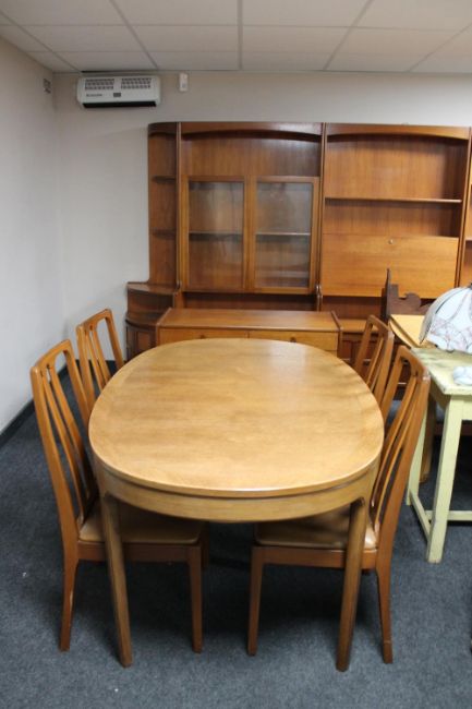 A mid century teak oval dining table and four chairs, together with a four drawer storage cabinet and multi section storage unit by Nathan Furniture