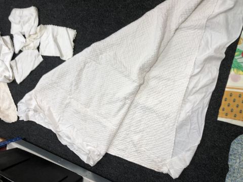 A box of antique and later bed linen, throw etc