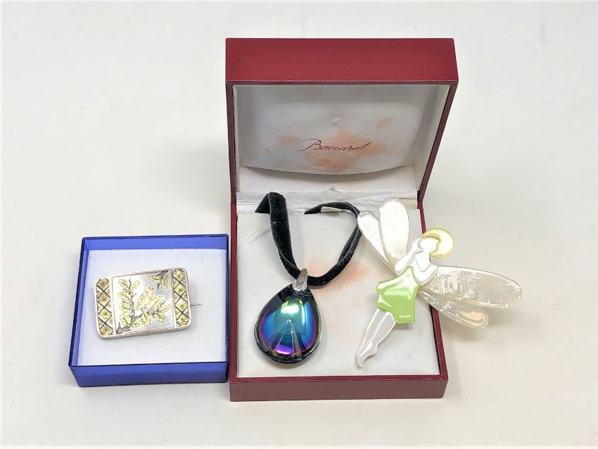 A Victorian three-tone silver memorial brooch depicting a bird perching, a boxed Baccarat 'Psychedelic' iridescent silver mounted pendant and a fairy costume brooch (3)