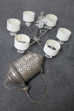 A contemporary ceiling light and a metal hanging lantern