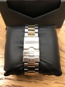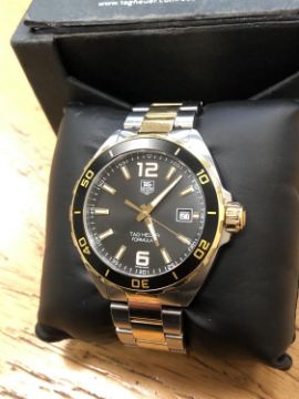 A gent's Tag Heuer stainless steel and yellow gold Formula 1 quartz calendar wristwatch, ref. WAZ1121, case 42mm, black dial with Arabic and baton numerals and centre seconds, on Tag Heuer steel and gold bracelet with deployant clasp, with box.