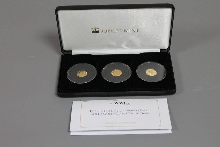 A Jubilee Mint three coin set, 'The Centenary of World War I Solid Gold Coin Collection', three 9ct gold proof coins, gross weight 3.2g, a limited edition of 499, boxed with certificate of authenticity.