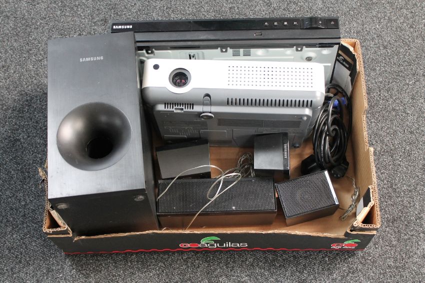 A box of Sanyo projector, Samsung DVD player, speaker surrounds etc