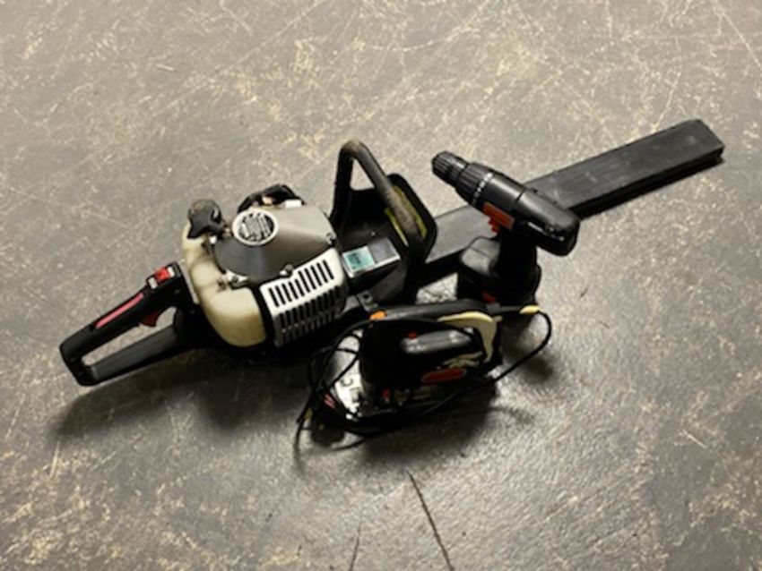 An electric Challenge jigsaw, a drill and a petrol hedge cutter