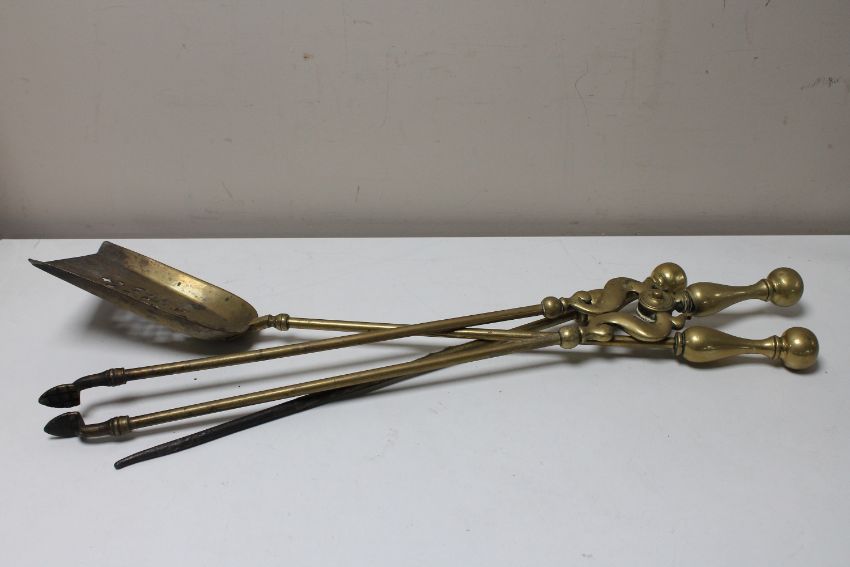 A three piece Victorian brass companion set
