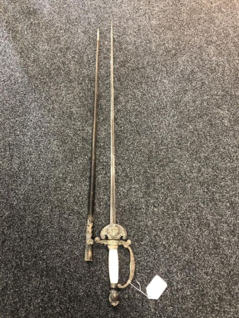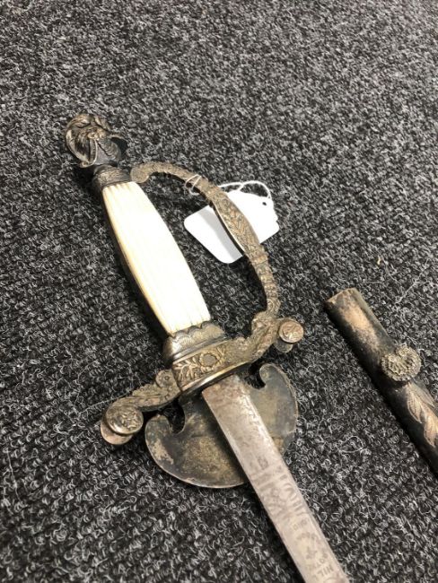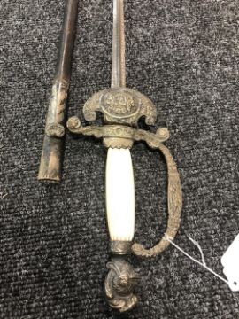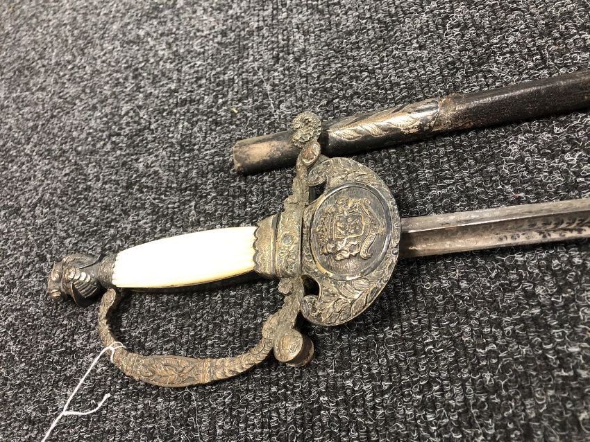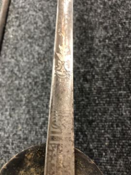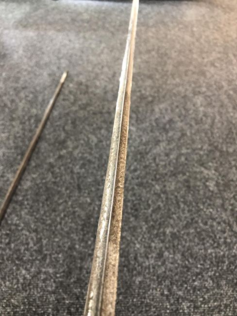 Blade 85cm. Blade pitted. Scabbard tip loose and held together with sticky tape. The scabbard is nice and rigid. Overall this is in good condition. See images.