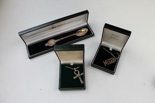 A silver commemorative spoon from The London Mint and two pendants on chains