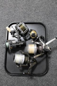 A tray of fishing reels : Alpha X etc