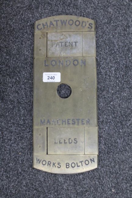 A Chatwood's heavy brass safe-maker's lock surround, 35 cm x 14 cm.