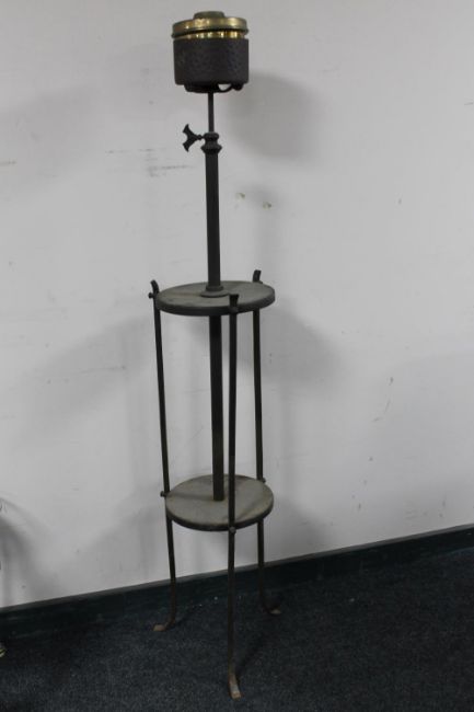 An antique rise and fall wrought iron oil lamp base