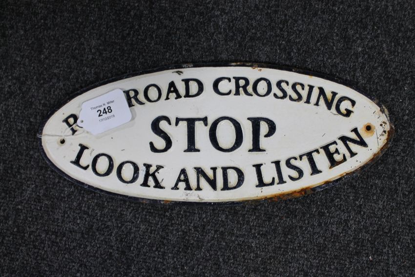 A metal railway sign : Railway Crossing Stop Look And Listen, 15 cm x 37 cm.