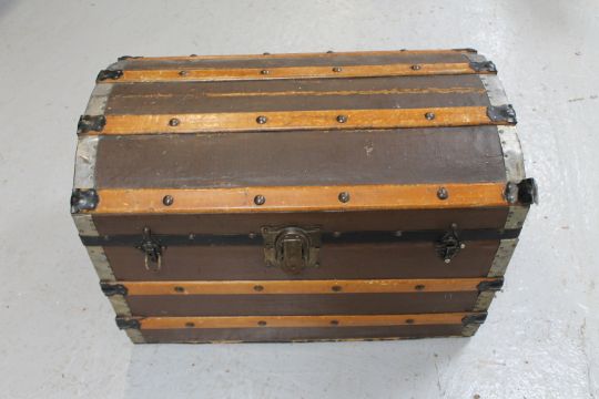 An early 20th century wooden bound dome topped travelling trunk