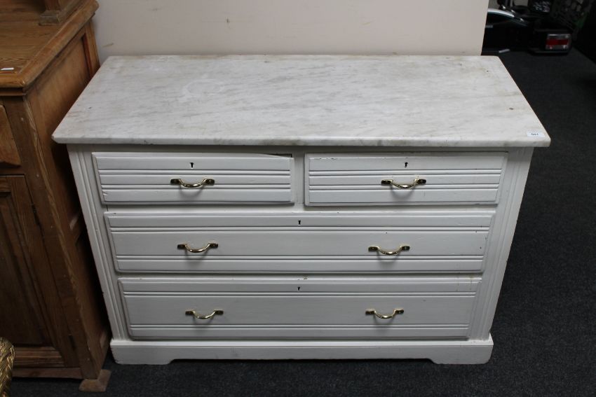An antique pine painted four drawer chest with marble top