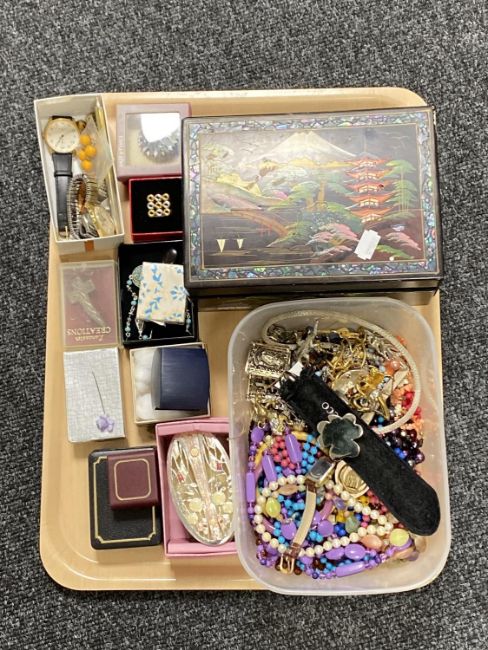 A tray of costume jewellery, lacquered trinket box, wristwatches, etc