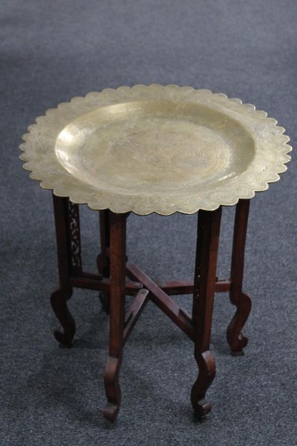 An ornate brass topped table on a folding wooden base