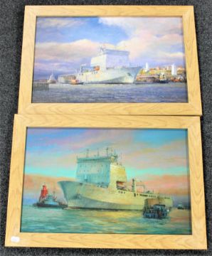 A pair of framed Walter Holmes prints depicting boats on the Tyne