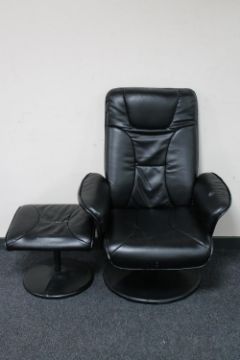 A black leather swivel armchair with matching footstool