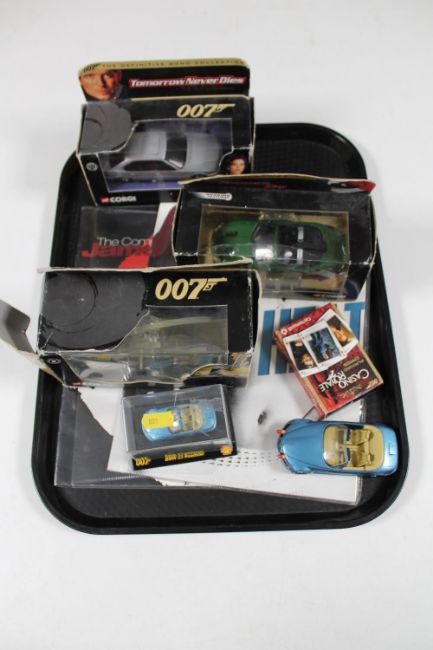 A tray of three boxed 007 Corgi vehicles, two further die cast vehicles, Casino Royale playing cards etc
