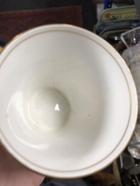 One teacup with hairline crack to base. Two saucers with glazing cracks running from the centre to the rim. Minor wear to gilding. Otherwise good condition.