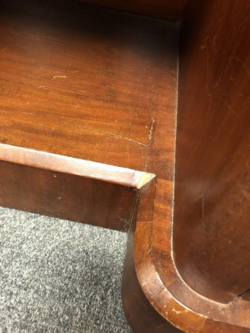 137cm wide by 56cm deep by 82cm high. Some very small veneer losses. Drawers all run smoothly. Lacking mirror back, there are two vacant holes in the marble top as a result. I cannot see any signs of worm. Generally in good condition.