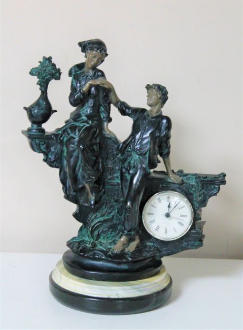A continental style resin figural mantel timepiece
