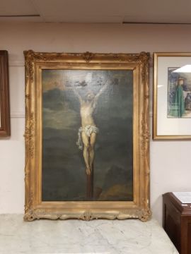 19th century school : The crucifixion of Christ, oil on canvas, indistinctly signed, 104 cm x 72 cm