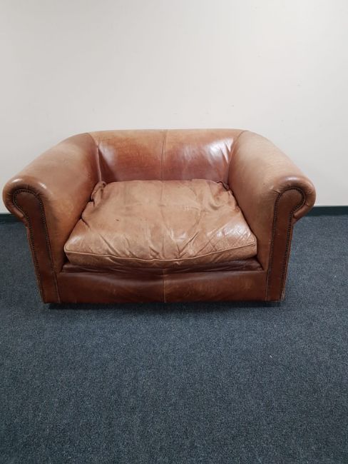 A tan leather oversized armchair