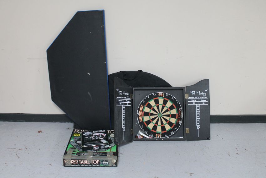 Three table top poker tables together with a Texas Hold 'Em poker set and a dartboard in cabinet