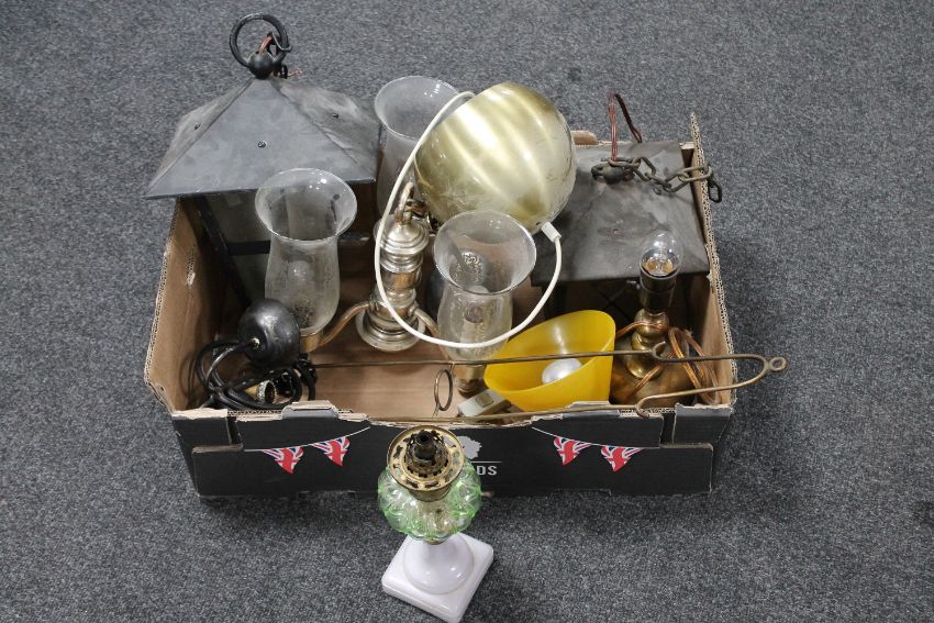 A box of assorted continental light fittings, brass table lamps, antique oil lamp with green glass reservoir on green glass base
