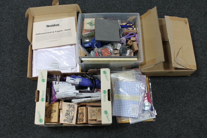 Four boxes of assorted crafting accessories, scrap book inserts, stamps etc