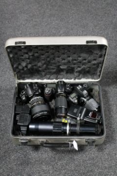 A camera case containing Nikon D300, Nikon D3100, Nikon 120mm macro lens, 450mm lens, Nikon SB-25 flash, Nissin flash, Nikon F80